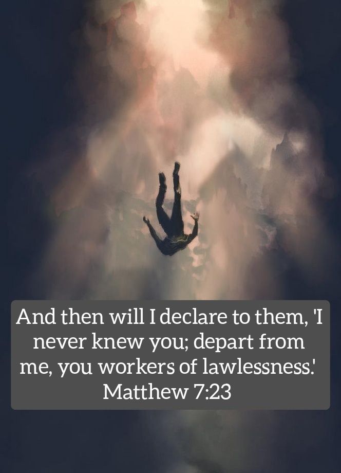 21 “Not everyone who says to me, ‘Lord, Lord,’ will enter the kingdom of heaven, but the one who does the will of my Father who is in heaven. 22 On that day many will say to me, ‘Lord, Lord, did we not prophesy in your name, and cast out demons in your name, and do many mighty works in your name?’ 23 And then will I declare to them, ‘I never knew you; depart from me, you workers of lawlessness.’